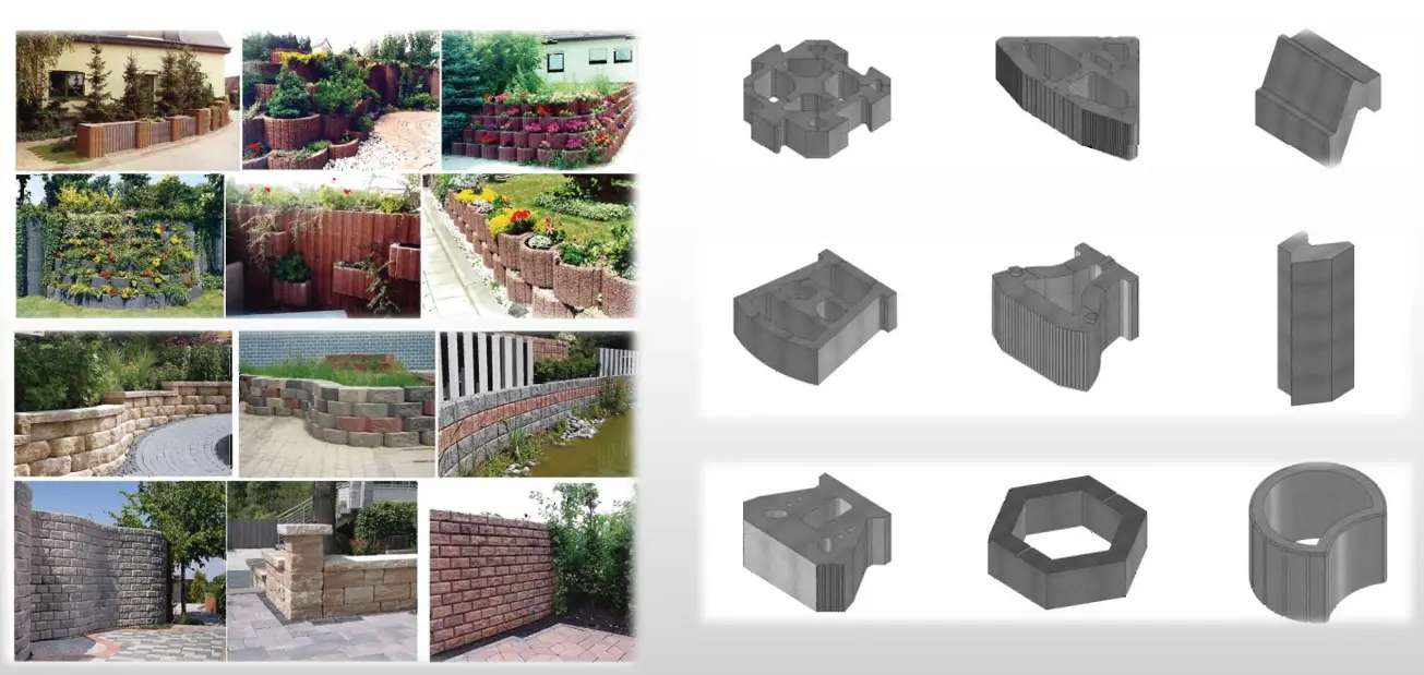 Večnamenski kalupi za blok stroje se običajno uporabljajo v povezavi z blok stroji. Z zamenjavo različnih kalupov je mogoče izdelati različne vrste blokov, kot so porozna opeka, votli bloki, robniki, tlakovci, zatravniki, opeke za zaščito pobočij in drugi cementni izdelki. Izdelki, oblikovani z večnamenskimi blok strojnimi kalupi, so zelo stabilni in imajo nizko stopnjo odpadkov. Zasnova večnamenskih blok strojnih kalupov omogoča prilagajanje različnim proizvodnim potrebam, izdelke različnih specifikacij pa je mogoče proizvesti s preprosto zamenjavo kalupa. Večnamenski kalupi za blok stroje so izdelani iz visoko natančnih in visoko trdnih materialov ter imajo dobro odpornost proti obrabi za podaljšanje življenjske dobe. Večnamenske blok strojne kalupe je enostavno zamenjati in vzdrževati.